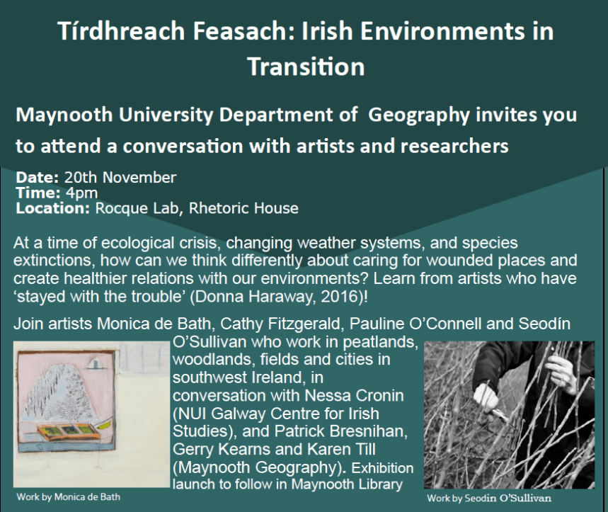 The Symposium opened with an address by President of Maynooth University, Professor Philip Nolan, which was followed by short conversations with the artists Monica de Bath (Kildare Co.), Cathy Fitzgerald (Co. Carlow), Pauline O’Connell (Co. Kilkenny) and Seodín O’Sullivan (Dublin), who were paired with Dr Patrick Bresnihan (Maynooth Geography), Dr Nessa Cronin (NUI Galway, Centre for Irish Studies), Prof. Gerry Kearns (Maynooth Geography) and Prof. Karen Till (Maynooth Geography) respectively. Following the symposium, Lucina Russell (Kildare County Council Arts Service officer) launched the Earth Writings: Bogs, Forests, Fields, Gardens exhibition at the Maynooth University Library.